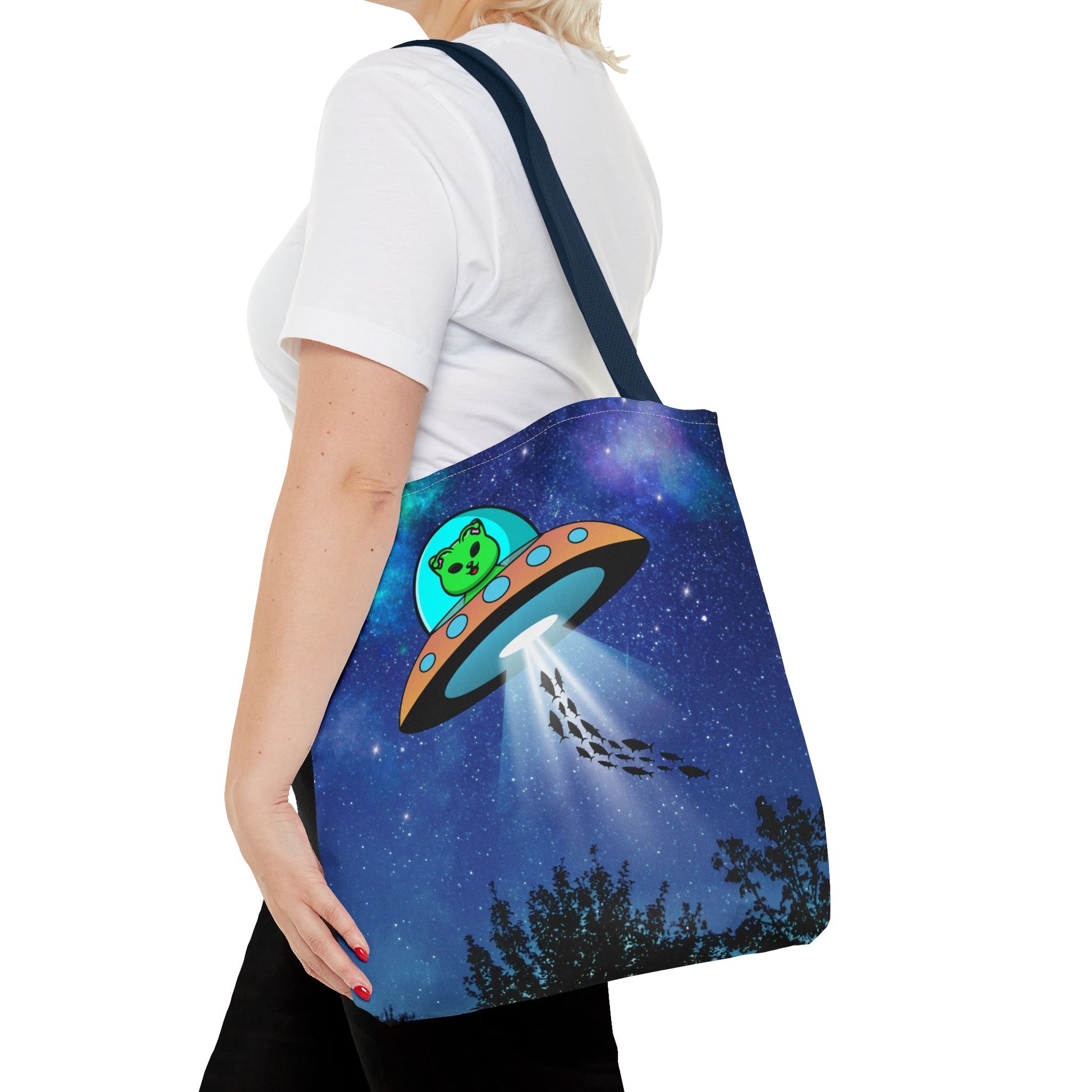 Elevate your accessory game with this unique and stylish eco-Friendly bag. Crafted with a fun design of a cat-in-a-UFO beaming up some fish for the ride home, it brings a playful vibe to your daily outings. Perfect for students, cat lovers, and anyone looking to showcase their quirky personality. This bag is ideal for casual days, weekend getaways, or even as a thoughtful gift. Whether you're heading to the market, library, or park, this tote adds a touch of whimsy to any occasion, making it a great choice for birthdays, holidays, or just because. Carry your essentials in style while showcasing your love for all things extraterrestrial!